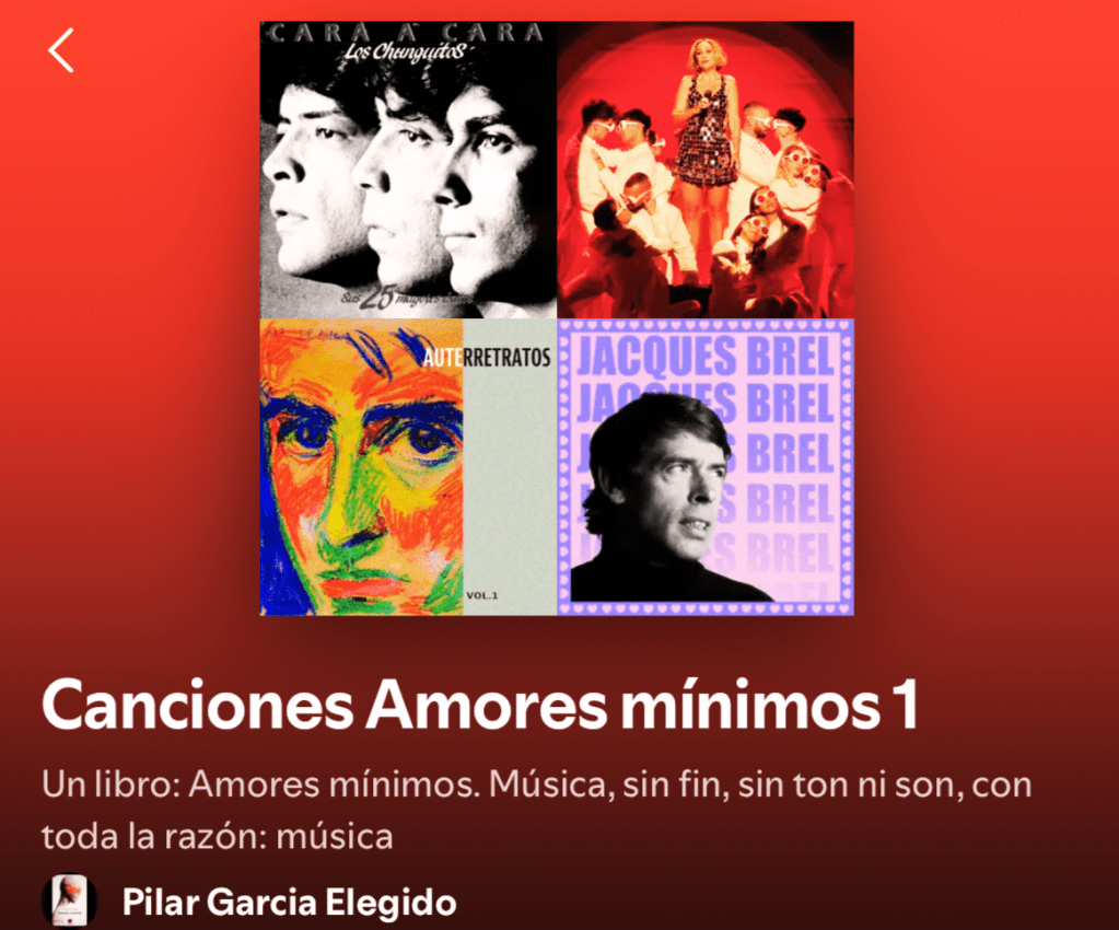Para quien interese, hemos colgado 10 listas tituladas Canciones Amores Mínimos y numeradas en Spotify. Solo tenéis que buscar «Canciones Amores mínimos 1» o teclear mi nombre y apellido, en este caso, para que aparezca la lista completa.